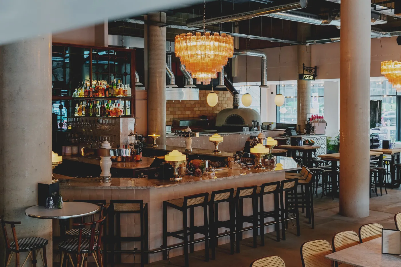 An upscale urban bar with coal-fire oven, party bar and distillery